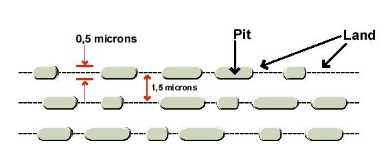 | Die Daten liegen in einer von innen nach außen verlaufenden, spiralförmigen Spur. Bei einer CD mit 650 MByte (74 Minuten) beträgt die Spurweite 1,6 µm. Die Spur besteht aus 120 nm tiefen und 0,5 µm breiten Vertiefungen in der Metallschicht. Die Vertiefungen nennt man Pits, der Bereich zwischen zwei Pits heißt Land. Die Datenspur enthält maximal zirka 22'000 Windungen und ist bis zu 25 km lang. |