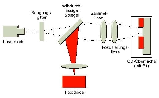 Ein Halbleiterlaser erzeugt den notwendigen Laserstrahl mit einer Wellenlänge von 780 nm. Das Beugungsgitter weitet den Strahl auf. Er passiert einen balbdurchlässigen Spiegel, und eine Sammellinse (Kollimator) parallelisiert den Strahl. Ein Fokussierungs-Linsensystems verengt ihn, sodass er deim Auftreffen auf die CD-Oberfläche nur etwa 0,8 mm breit ist.