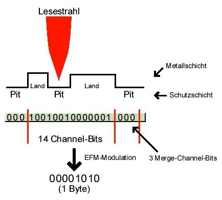 Die Umwndlung von 14 Channel-Bits in ein Byte erfolg durch die EFM-Modulation. Die Dekodierung beim Auslesen geschieht über eine Tabelle, die in der Steuerungselektronik jedes Laufwerks implementiert ist.