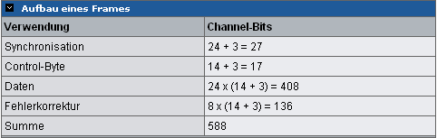 Um Daten effektiv speichern zu können, werden mehrere Bytes zu größeren Blöcken zusammengefasst. Die kleinsten dieser zusammenhängenden Informationseinheiten einer CD nennt man Frames. Ein Frame besteht aus 588 Channel-Bits, von denen nur 408 Bit - das sind 24 Byte - Nutzdaten enthalten.