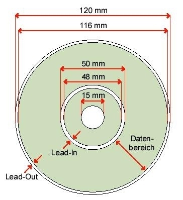 | Der Aufzeichnungsbereich liegt zwischen 46 und 117 mm. Er teilt sich in Lead-in (Das Lead-in enthält das Inhaltsverzeichnis (TOC) der CD. Es beansprucht die innersten 4 mm des Aufzeichnungsbereichs.), Datenbereich (50 mm - 116 mm) und Lead-out (Das Lead-out markiert das Ende des Datenbereichs der CD. Es befindet sich im letzten Millimeter des Aufzeichnungsbereichs am äußeren Rand der CD.). Im Lead-in befindet sich die TOC der CD, das Lead-out markiert das Ende der Aufzeichnung. |